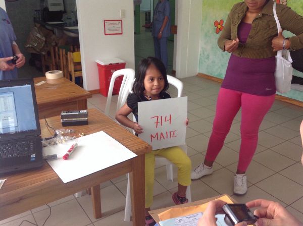 Little Maite is one of the first of 35 children and 20 adults that were assessed during the day. She is having her picture taken for her patient file. Then she is off to see the surgeon who will determine if she is ready for surgery.