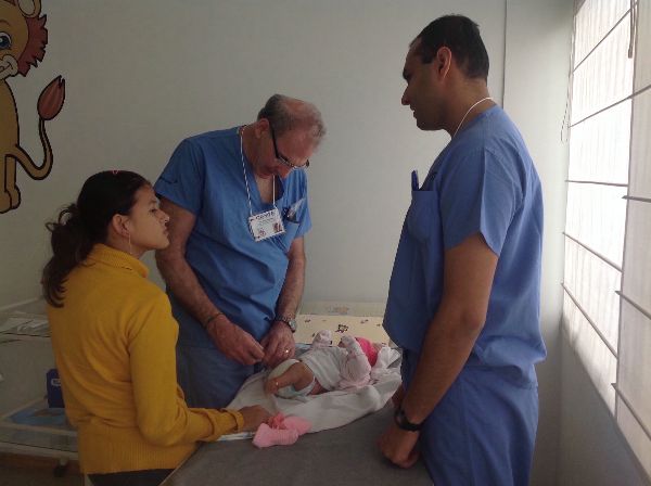 Dr. Moreau and Dr. Gupta examine two months old baby Scarleth while her mother looks on expectantly.