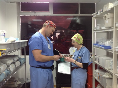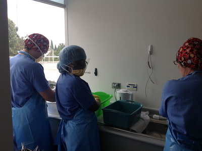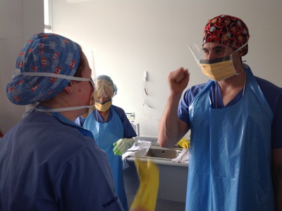 Cleaning the surgical instruments is a dirty job but someone's gotta do it. Students Alex Webb and Scott Moorman in a game of rock-paper-scissors to decide on who gets to wash or dry. Scott won this one!!!