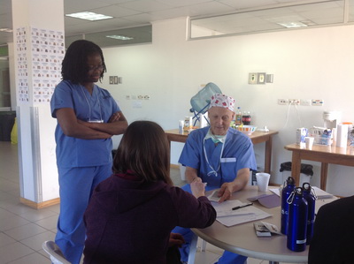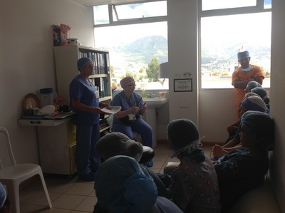 Recovery Room nurse Mairi Gordon (with Lucina Correa translating) exchanges information with local nurses on Canadian recovery room nursing procedures.