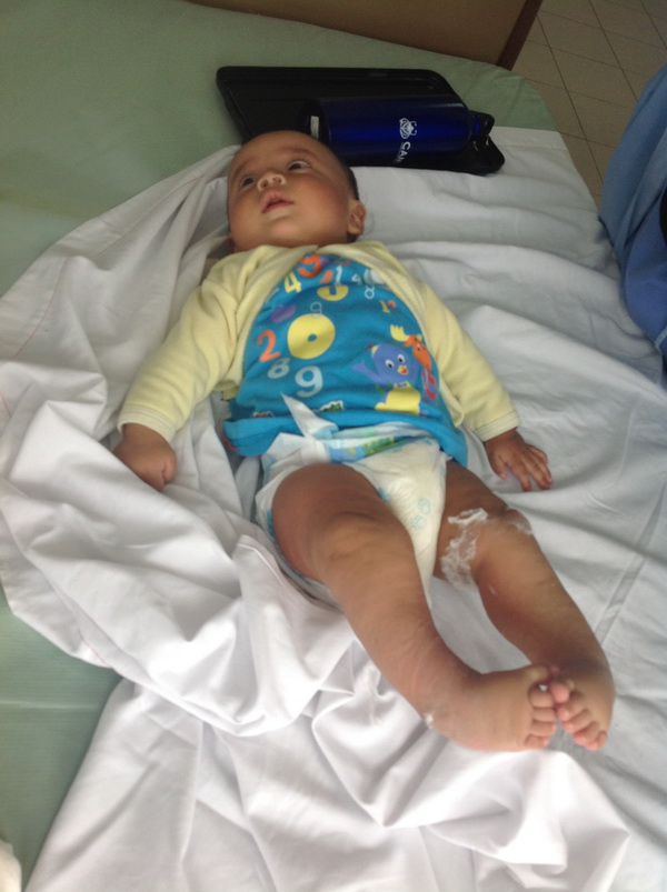 Baby Jeremy bravely endures the procedure that puts his tiny little legs in a cast from his toes all the way up his thighs. Dr. Gupta and CAMTA team member Barb Moreau work quickly so that Jeremy can be returned to the comforting arms of his mother.