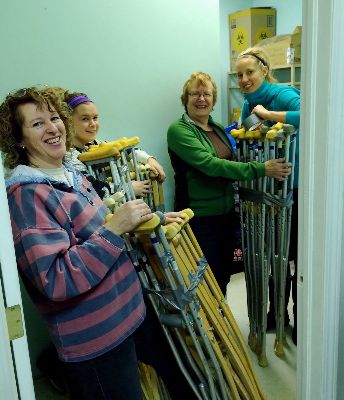 Brenda, Justine, Lois and Kristen check the crutch supply