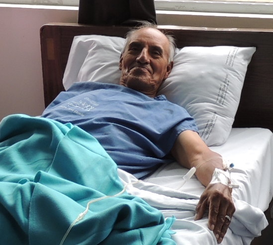 This is Cesar Criollo Casamen who, at age 66, had his left hip replaced this morning. He used to work as a textile dyer, and now works around the house. His lovely wife Teresa Cueva was waiting for him after his operation, and Cesar looks forward to getting back to Tambillo where his three children and six grandchildren also live. By the end of the day, the physiotherapist team had Cesar on his feet.