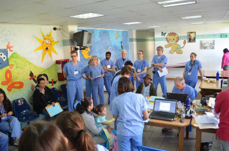 As the clinic opens, Matthew and Barb gather the clinic team together to explain the patient flow through the clinic and to point out where the designated pediatric, adult, physio, GP, and nursing areas will be.