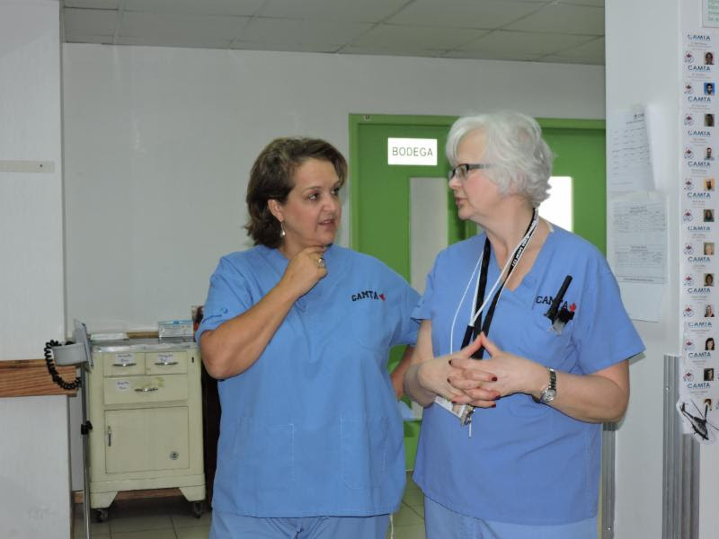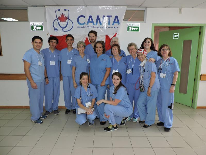 | The CAMTA team poses with Marianick. From left to right Translator Francisco Gallardo, local Translator Students Jose and Gabriel, Barb, Matthew, Dr. Stacey, Marianick, Adult Ward Nurses Kayla Strickland, Judy Chaffee, Deb Chalupa, Physiotherapist Joanne Montgomery, Translator Alexandra Tapia, Pediatric Ward Nurse Julie Cadrin, and Dr. Hurlburt. |