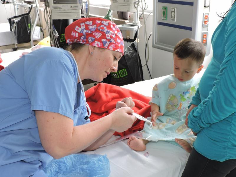 | LPN Pediatric OR Nurse Saison Demitor gives patient Milan (2 years old) stickers before his tendon release surgery to correct his club foot. |