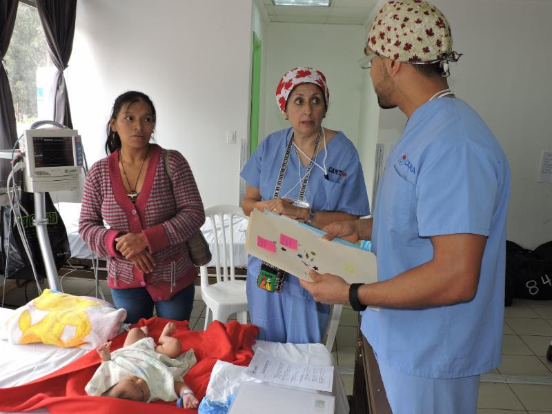 | Pediatric OR Nurse Ricardo Rodas (far right) helps to answer questions prior to surgery for the mother of an infant patient, Brintanny, with the help of Translator Alexandra Tapia (middle). |
