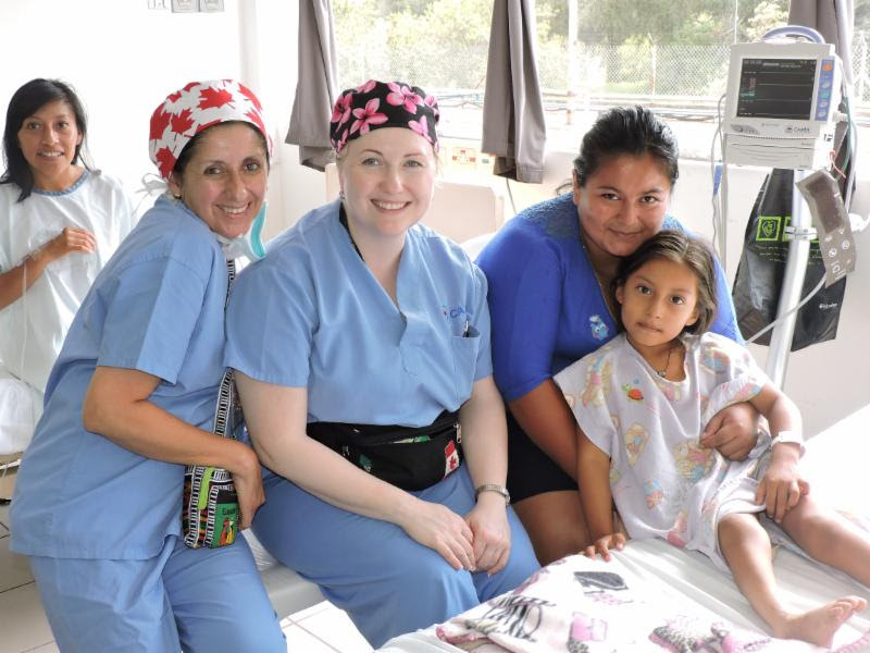 | Alex and Pediatric/Adult Recovery Room Nurse Mairi Gordon (middle left) cuddle up to 5 year old Quishpe and her mother before Quishpe's surgery. |