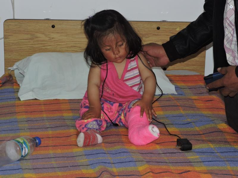 | Natalia (2 years old) sits on her bed checking out her tiny pink cast. |
