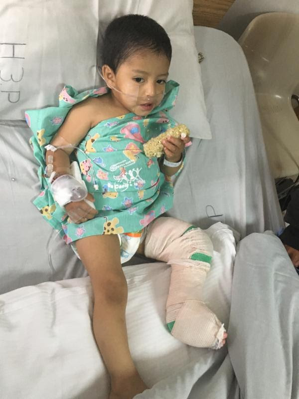 Kevin, 2 1/2 years old, was born with a club foot. Although he was mobile, his left foot prevented him wearing footwear and walking normally. Kevin had surgery to correct his foot yesterday and will be discharged today. He has four siblings waiting for him at home.