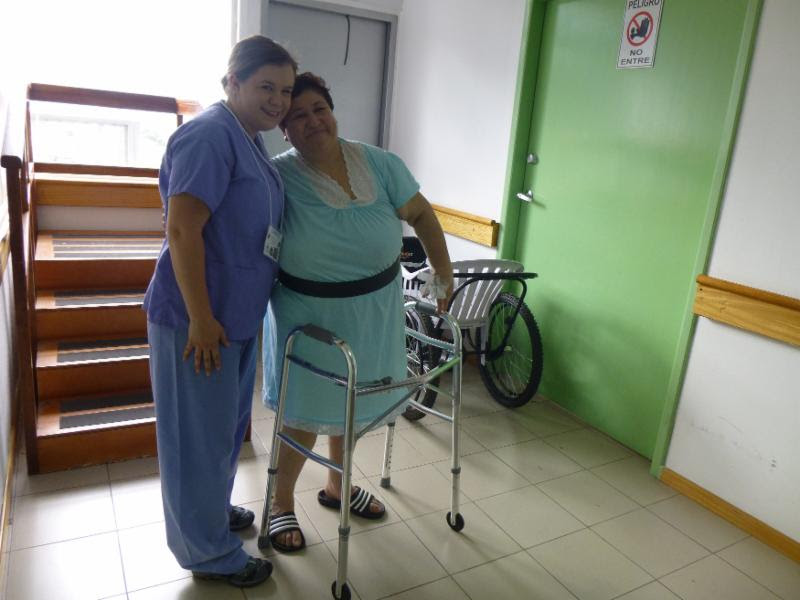 | Physiotherapist Aid Justine Ferguson helps Marcela learn to walk with her new hip. |