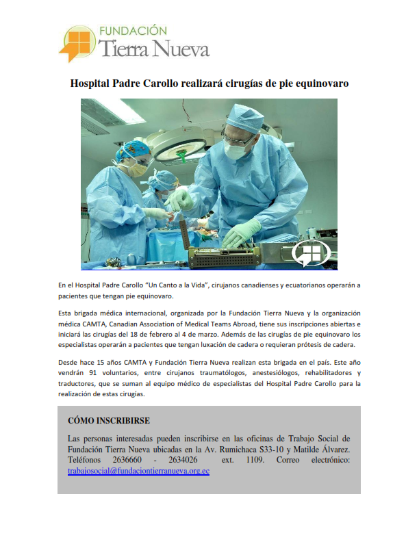 At Padre Carollo Hospital “Un Canto a la Vida” , Canadian and Ecuadorian surgeons will operate on patients who have club foot.