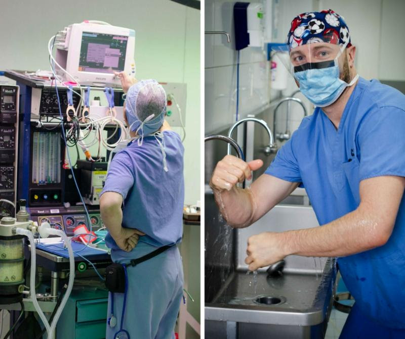 Andy Escalona (Respiratory Therapist) prepares the monitors while Dr.Scott Westberg (resident in Orthopaedics) and the others scrub in.