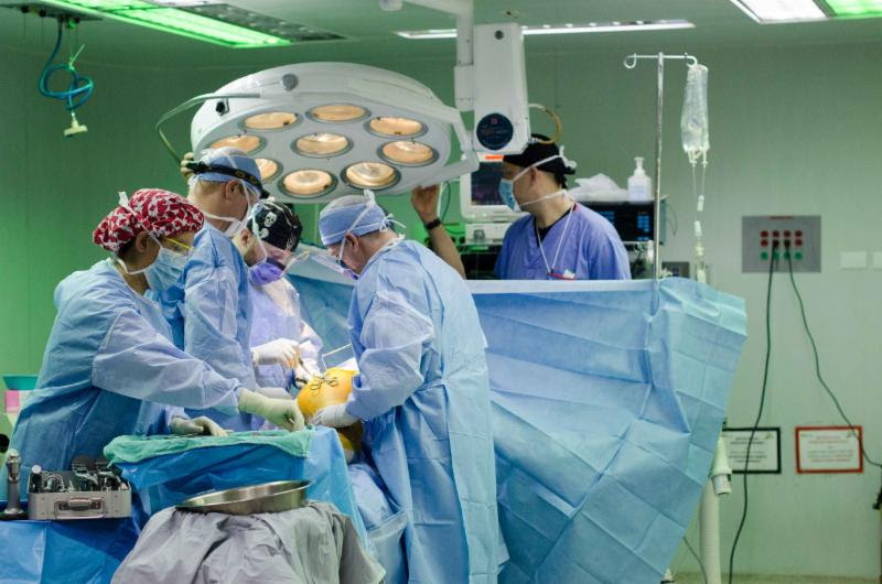 The anesthetist and respiratory therapist then take care of administering general (children) and spinal (adults) anesthesia to the patient. While all this goes on in the OR, the surgeons have to “scrub-in” (to wash their hands and forearms very thoroughly) and to wear sterile gowns and gloves. By the time they are finished scrubbing and getting dressed, the anesthetist has administered the anesthetic medication and the patient is ready to be placed, cleaned and draped for the surgery.
