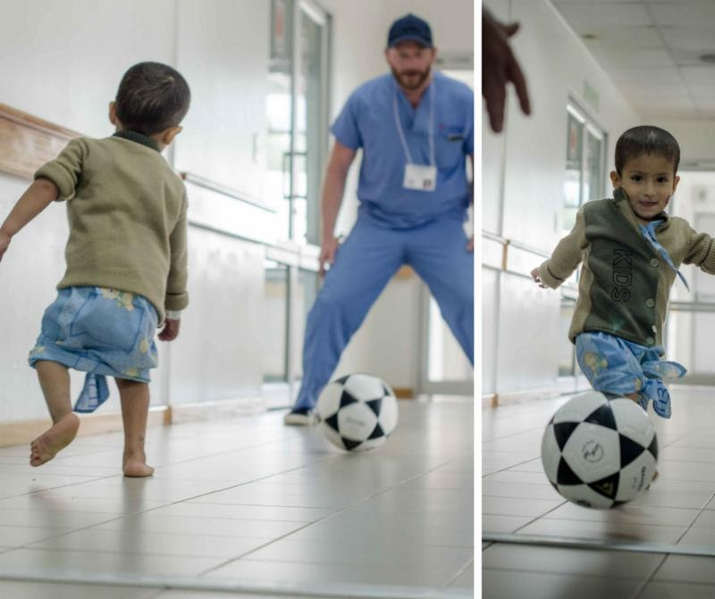Iker was sulking when he arrived in pre-op because he was hungry. To keep his mind off the hunger, our nurse Cathy and translator Tim (in background) started a “futbol” game!