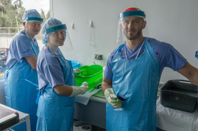 ordon Giesbrecht (Lay Person), Nicole Masson (Student), and Steve Chevalier (Lay Person) decontaminate instruments immediately following a surgical procedure