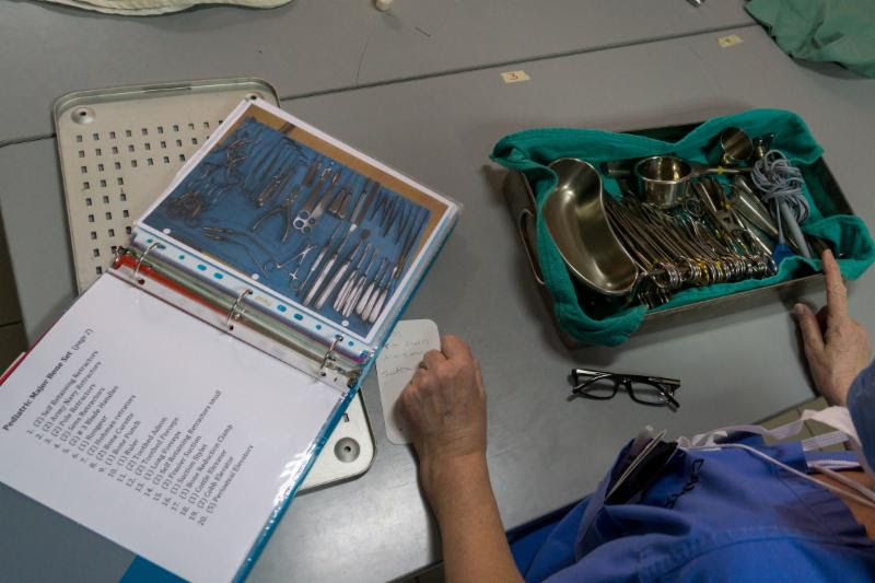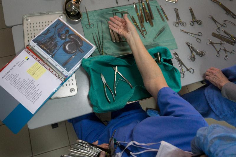 What happens to reusable surgical instruments after they have been used in surgery? They are sent to the medical device reprocessing department. In Quito, a number of students, lay people, and nurses make up our reprocessing team. First, the instruments must go through a decontamination process where they are scrubbed clean of all biological material such as blood and bone. Next, the freshly washed instruments arrive in a clean assembly area where sets are pieced together according to the binder of set lists. Once the sets are completed, and double-checked, they are wrapped with a robust puncture resistant cloth material that can be penetrated by steam or gas yet acts as an effective barrier to keep microorganisms out. Once wrapped, the set is sterilized in an autoclave. Medical device reprocessing is a crucial step in the hospital workflow, as this step prevent infections, ensures consistency in the operating room, and allows surgeons to perform more operations per day than instrument sets are available.