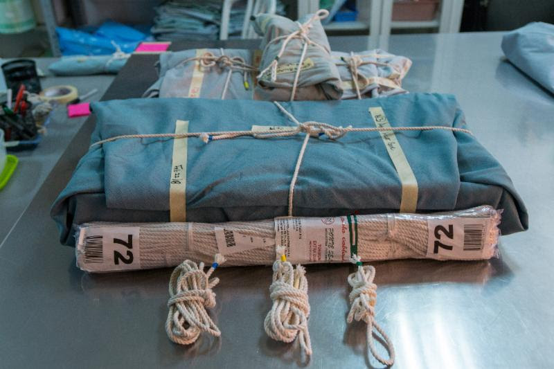 Typically, instrument trays are covered in a wrapper (disposable or reusable) and fastened with tape. When you are part of a team performing multiple procedures per day, the amount of waste can build up rapidly if using disposable materials. While in Quito, we use only reusable wrappers, and have also cut down drastically on tape use since Kathy picked up a trick from local Medical Device Reprocessing Staff. Thin rope, available from any hardware store, can be cut to specific lengths, colour-coded according to length (e.g. blue is long, yellow is medium, and green is short), then used to secure trays of a specific size like a parcel. Since the ropes can be reused many times, our waste production in Ecuador can be reduced substantially.