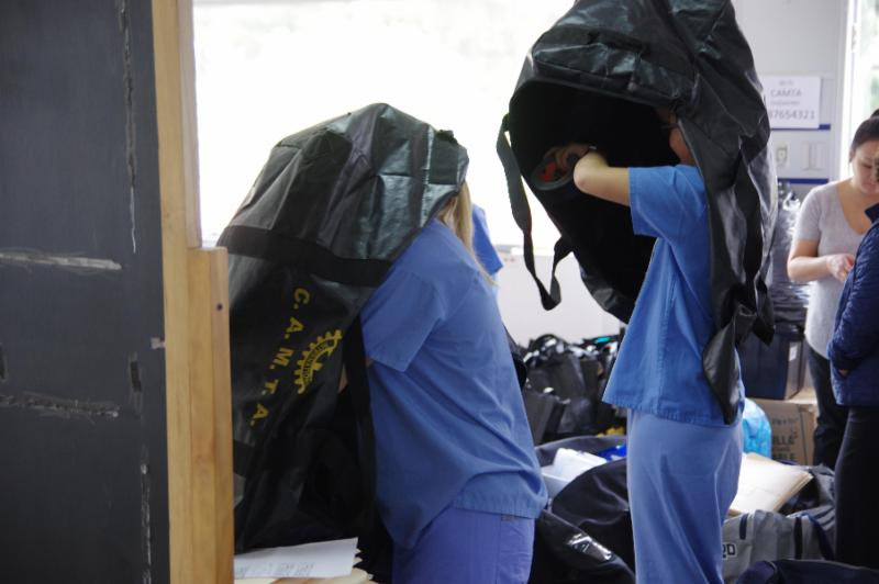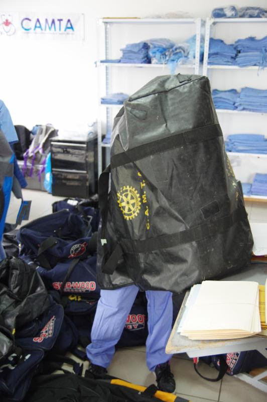 Even though week two has just arrived we always need to be mindful of our time and keep the Mission moving along. One of the things we have in abundance are large hockey bags. While innovative uses have been found for the mountains of full and/or empty bags, their primary purpose is for transporting all of the CAMTA equipment, linen and gear from continent to continent.