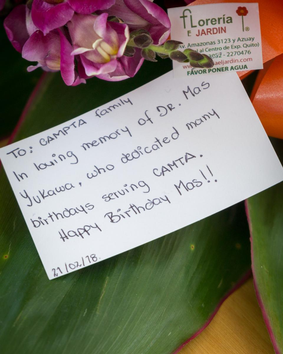 Dr. Mas Yukawa, an anesthetist, was a member of CAMTA for 4 years. He was loved by everyone on our team and passed away suddenly last August. Today is his birthday, and anonymous flowers were delivered to CAMTA this morning with a heartfelt note.