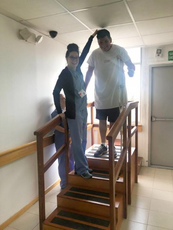 Barb Furler (Physiotherapist) and Frederico hit new heights on the practice stairs.