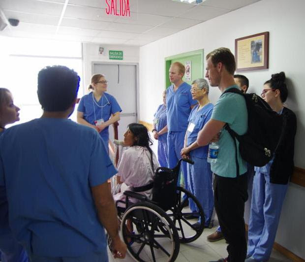 CAMTA team members gather around Maria as Martha Valencia (Translator) translates a very heart felt thank you letter that Augustine and Maria presented to CAMTA this morning. From left to right: Dr. Alex Gessner (Family Practice Physician), Jay Valencia (Translator) Anna Hebert (Physiotherapist), Maria, Justine Ferguson (Physiotherapist Aide), Dr. Tim Kostamo (Adult Orthopedic Surgeon), Dr. Paul Leung (Adult Orthopedic Surgeon), Dr. Ryan Wright (Family Practice Physician), Dr. Olivier Gauthier-Kwan (Orthopedic Resident), Barb Furler (Physiotherapist).