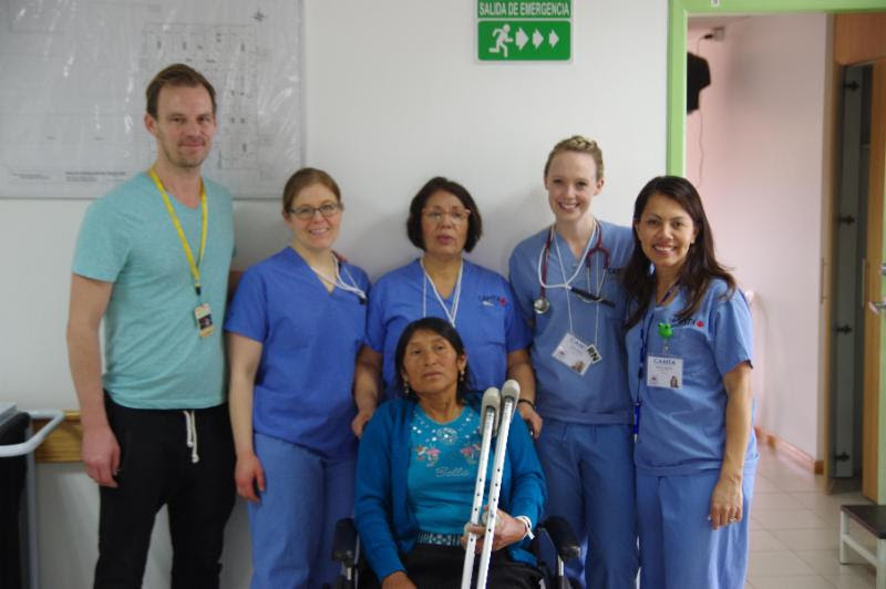 Dr. Ryan Wright (Family Practice Physician), Anna Hebert (Physiotherapist), Sussana Gaviria (Translator), Erica Nelson (Adult Ward Nurse), Martha Valencia (Translator) extend best wishes to Maria as she gets ready to head home.
