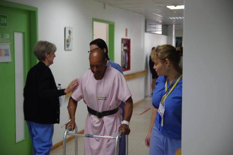 Barb Moreau (left, Administration) offers Oscar some encouragement as he takes his first post-operative steps. Oscar is supported by Barb Furler (Physiotherapist) in the background and Dr. Alex Gessner (Family Practice Physician).