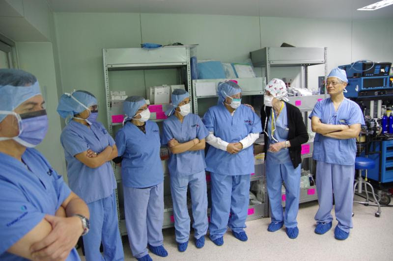 NH Collection staff, Barb Moreau (CAMTA Administration), and Dr. Paul Leung (Adult Orthopedic Surgeon) stand just inside the adult Operating Room.