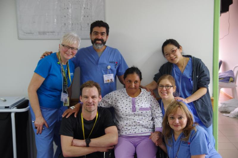 From left to right: Deb Chalupa (Adult Ward Nurse), Dr. Ryan Wright (Family Practice Physician), Jay Valencia (Translator), Blanca Quintana, Anna Hebert (Physiotherapist), Shinner Hsu (Adult Ward Nurse) and Dr. Alex Gessner (Family Practice Physician),