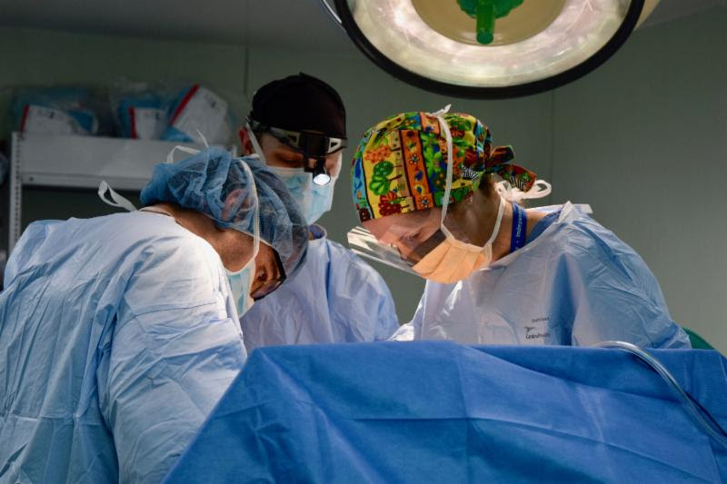 Dr. Ashlee Dobbe, Dr. Kyle Stampe (Pediatric Orthopedic Surgeons), Dr. Michael Goplen (Orthopedic Resident) and Helene Locas (Pediatric OR Nurse) at work in the Pediatric OR.