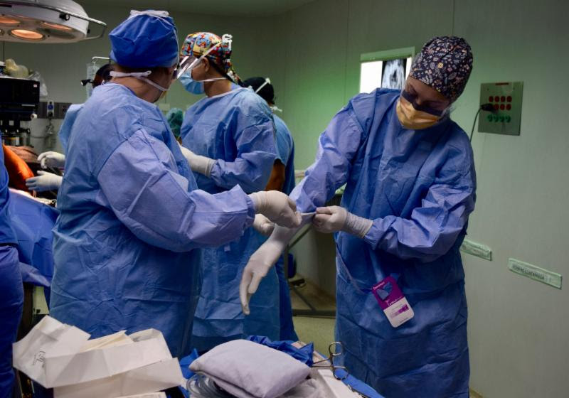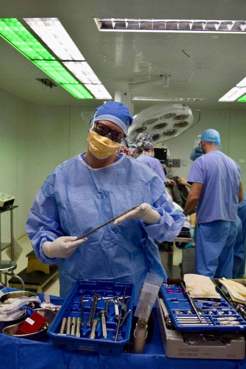 Cheryl Holt (Adult OR Nurse) prepares surgical equipment and helps Caitlin Marchuk (Medical student) scrub in for surgery.