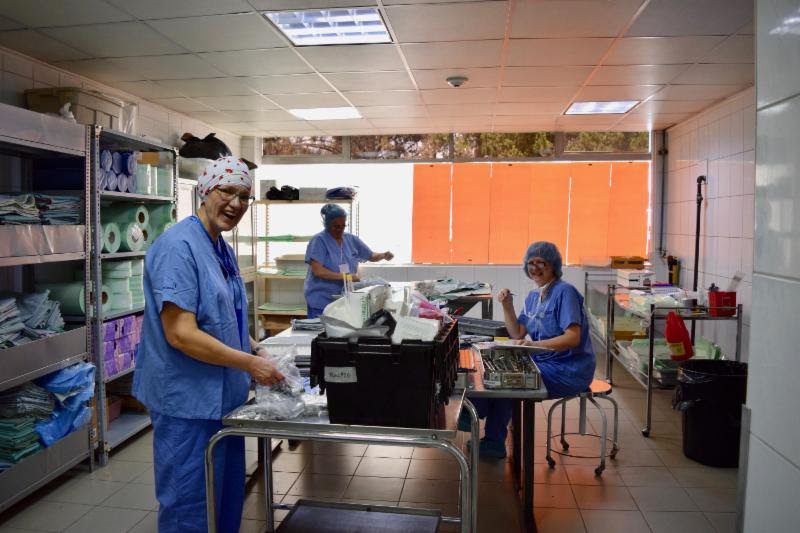 Setting up an OR requires not only sterilizing and wrapping equipment, but also making ropes to secure bigger sets, locating sets, checking packing lists, organizing the wrapping tables and ensuring that all required equipment is organized and ready for use. There's an immense amount of work that goes into the mission before the first surgery even takes place, and every team member plays a crucial role in making that happen.