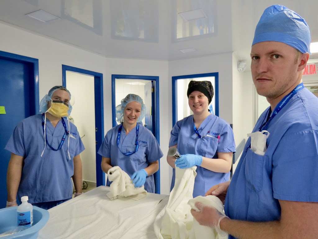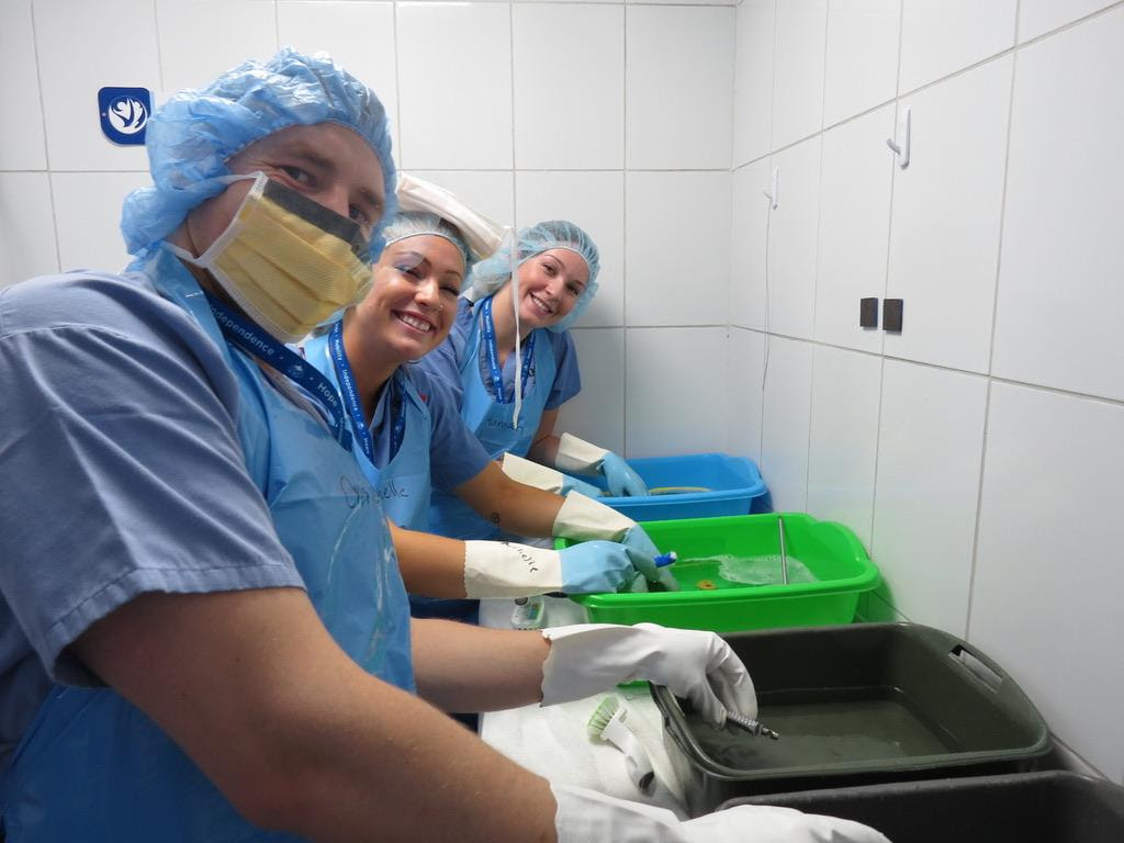 When a surgery finishes all of the equipment must be sent for sterilization. Before this happens, each instrument has to be cleaned by hand and packaged so that it can be adequately sterilized.