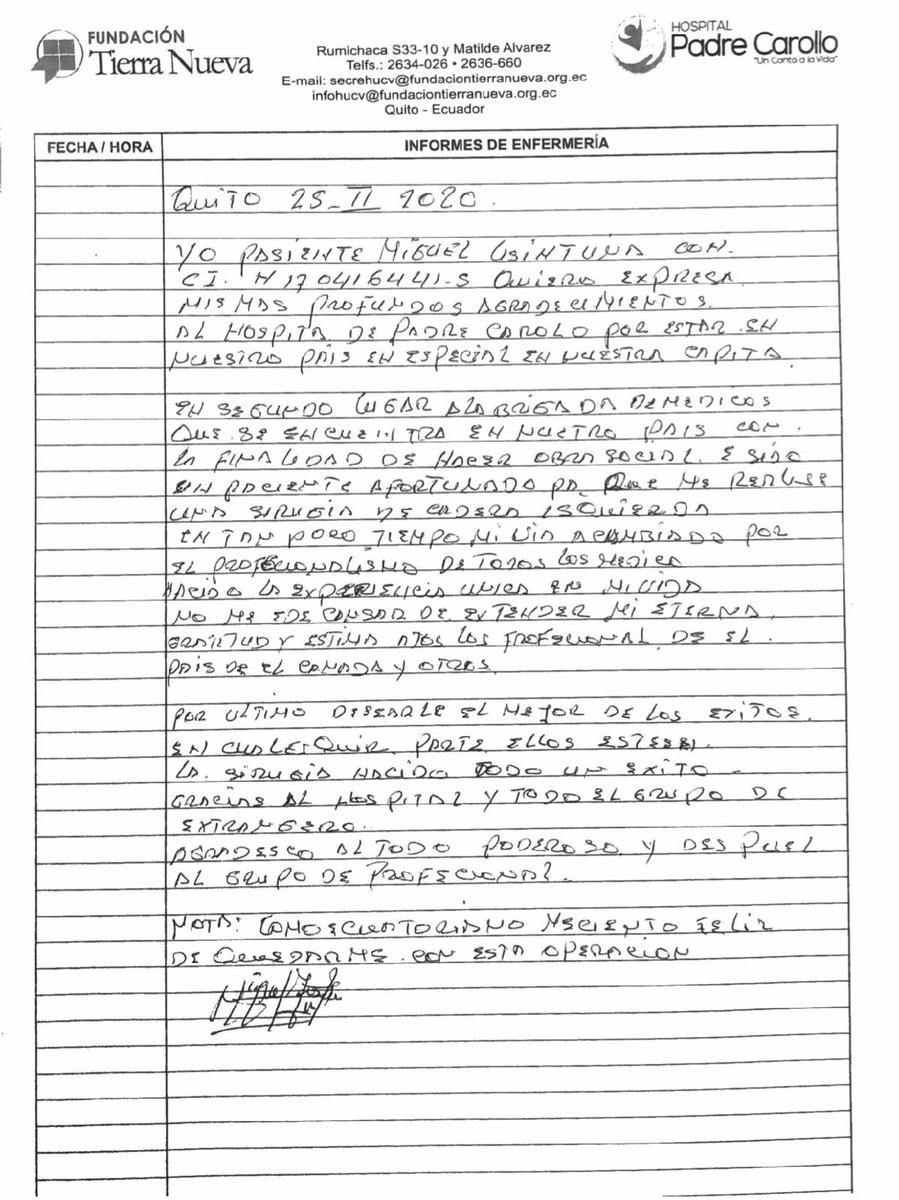 Before Miguel left the hospital, he spent about 15 minutes writing a thank you letter for his surgery and expressed his overwhelming gratitude.