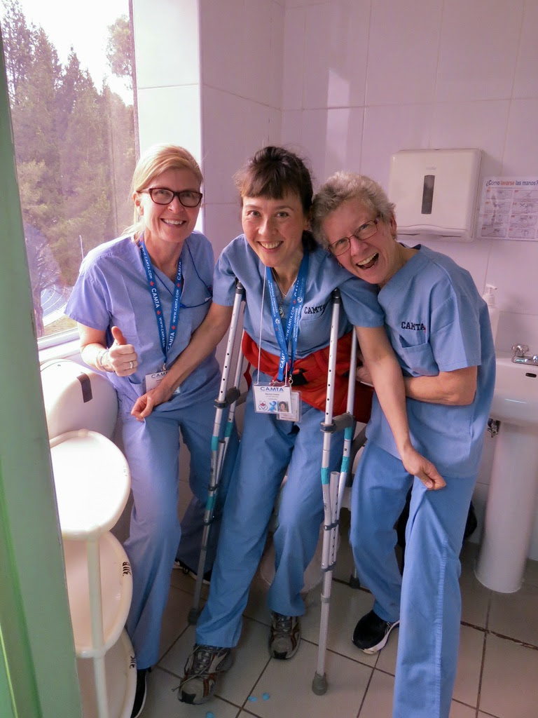 Another large part of a PTs job is suggesting support equipment/devices that will help patients regain their independence. The issue with these devices is that they can be quite expensive and inaccessible to many individuals. Rachel Oates, one of CAMTA's PTs is a born innovator and like many PTs she is constantly rigging up support equipment from materials patients already own. For example, she has made a leg-lifter from a pair of pajama pants or repurposed crutches to fulfill a similar purpose.