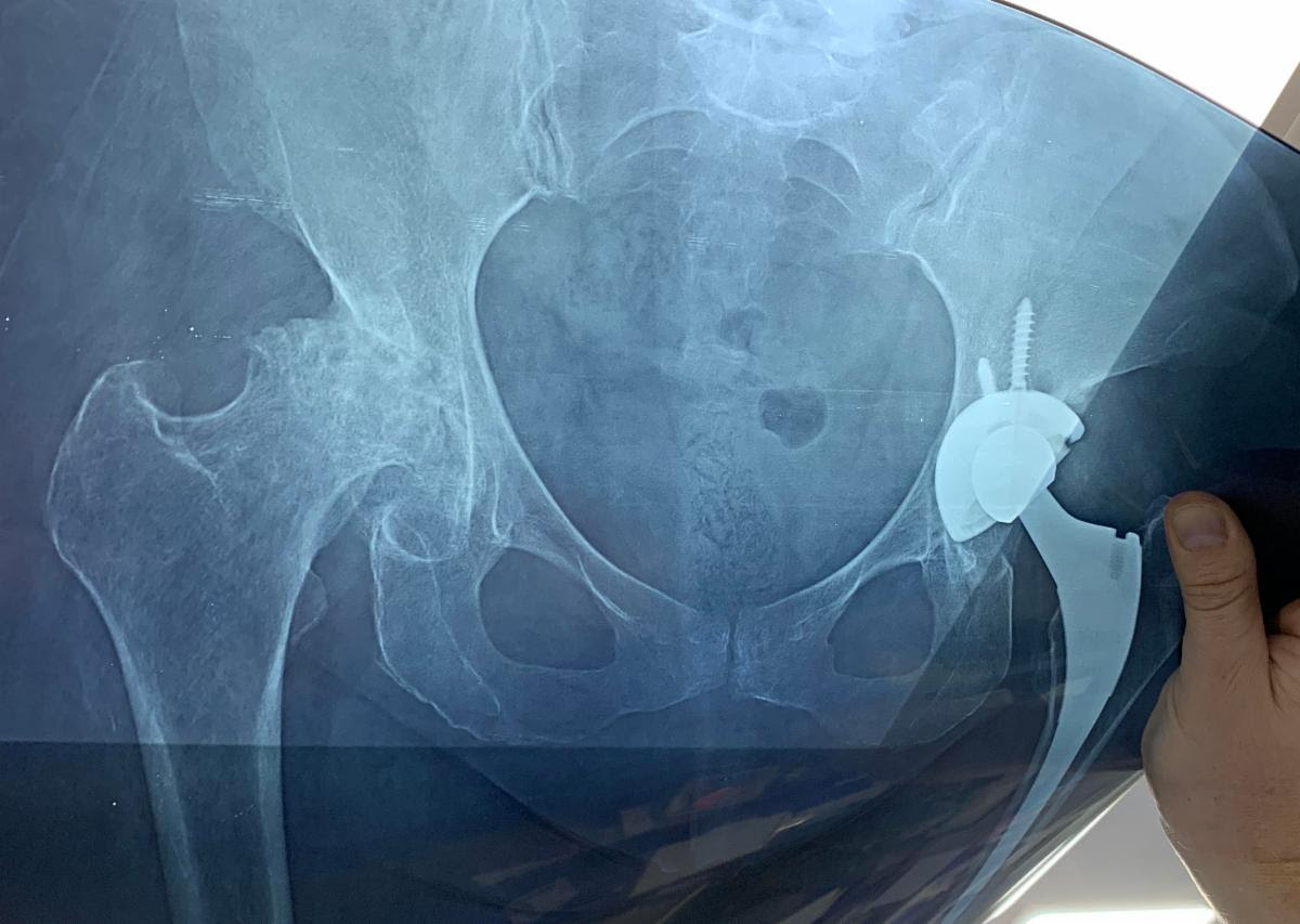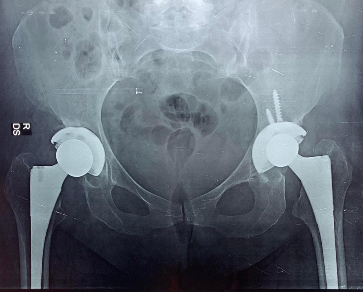 Manuja's hip before surgery. You can see the first replacement on the right, and the hip deterioration on the left